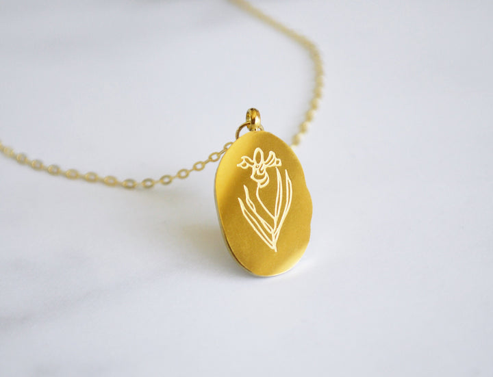This beautiful gold or silver February Iris birth flower necklace would be a perfect gift for a Mom, Grandma, Aunt, bridesmaid, friend, or any loved one. It's a perfect way to celebrate a family. The back of the pendant has the month and flower type engraved. You can add up to 4 birth flower pendants and birthstones. These are also available without a birthstone. It can be made with a gold or silver plated chain or a sterling silver, or 18k gold-filled chain and is available in 16, 18 or 20 inches (please contact us if you'd like it shorter or longer). They are high quality, dainty, and very pretty - the perfect delicate necklace for everyday wear. The birth flower pendant measures 11 X 20 mm (including the loop), and is made of stainless steel so it is hypoallergenic and won't tarnish. Please include the birthstone(s) in the personalization section. You can choose the necklace finish and month when checking out.
