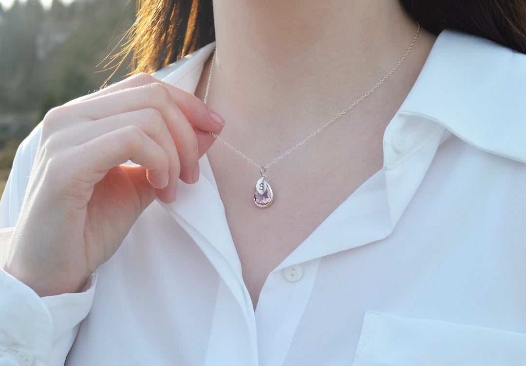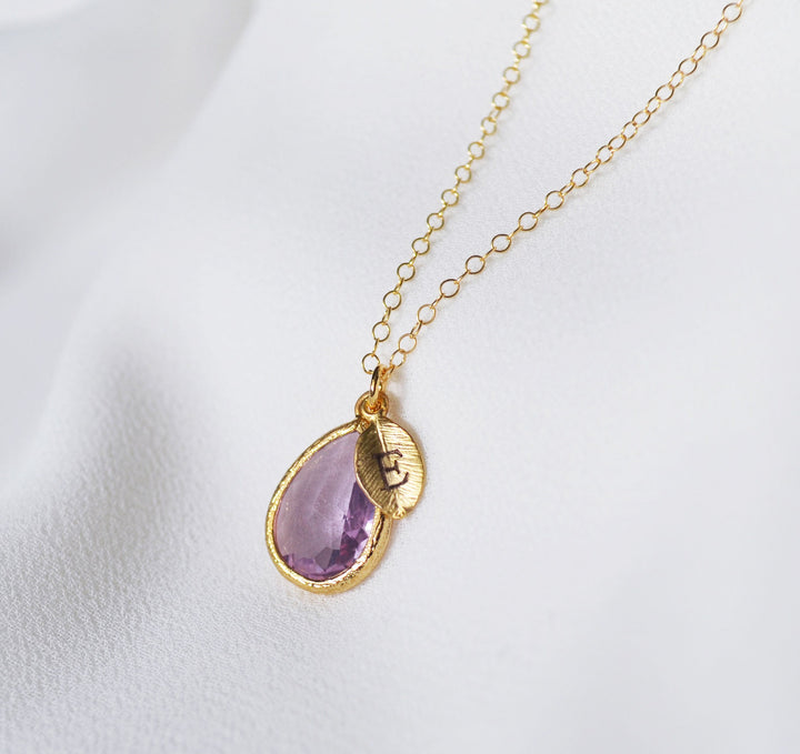 This beautiful lilac February birthstone necklace would be a perfect birthday gift, bridesmaid necklace, anniversary or graduation gift, or for any occasion. The silver, gold-plated, or rose gold lilac teardrop-shaped pendant is made of glass and shines beautifully in the light. It measures approximately 12.5x16mm and is hung on a 16", 18" or 20" chain. The chain options include silver-plated, gold-plated, rose gold-plated, sterling silver, 14K gold-filled, or 14K rose gold-filled metal. The chains are dainty and very pretty - the perfect delicate necklace for everyday wear. The silver, rose gold or gold-plated leaf charm is approximately .25 inches and is subtly stamped with an initial. The necklace can be purchased without the leaf or you can add up to 3. Please include the initial(s) in the personalization section. You can choose the leaf and necklace finish when checking out.
