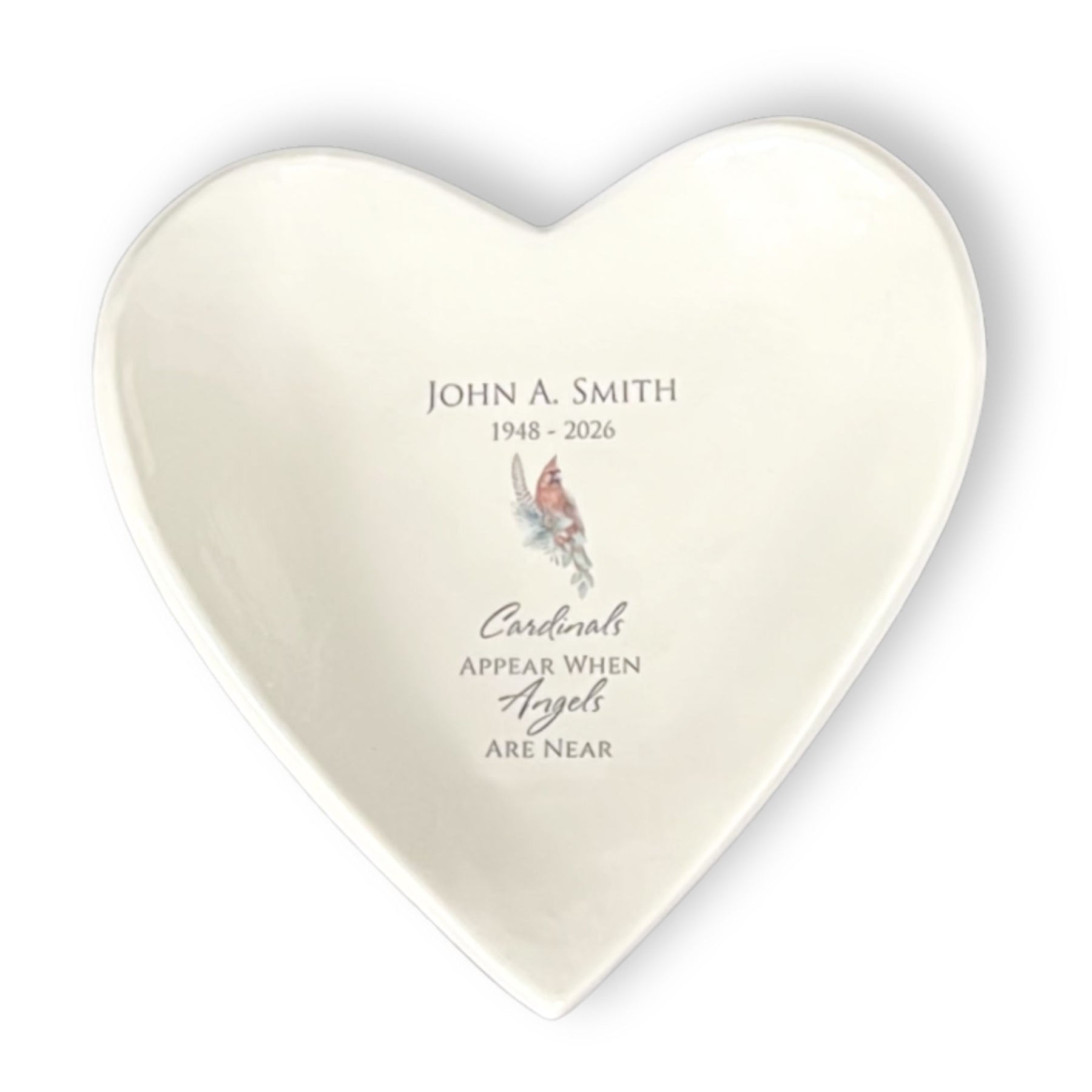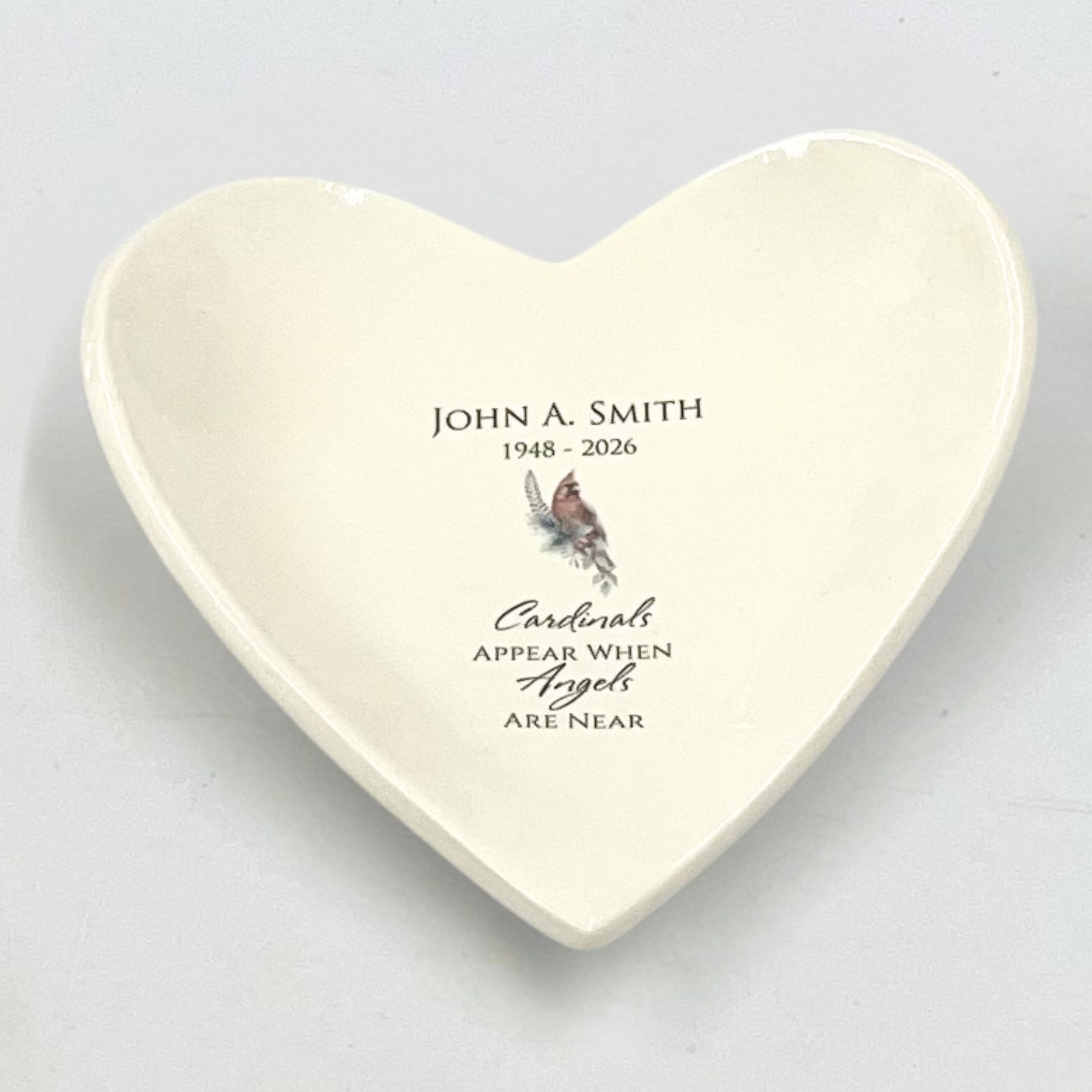 This heart shaped ceramic bowl (catchall) is a thoughtful and unique sympathy gift. It is completely handmade, fired in a kiln, glazed and kiln fired again. The dish is personalized with your loved one's name and years of life.