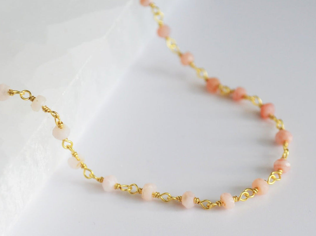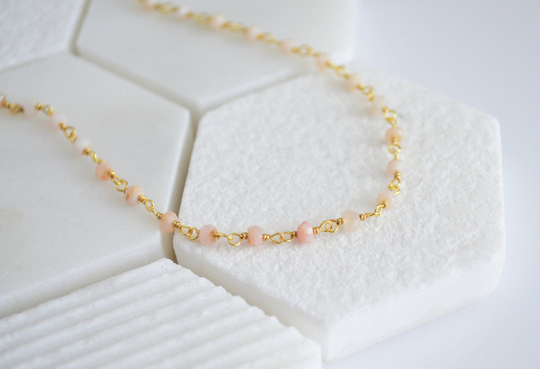 This beautiful dainty genuine Pink Opal beaded necklace, choker, or bracelet would be a perfect October birthday gift, mom gift, graduation gift, bridesmaid present, or just a treat to yourself. This is the perfect delicate piece to layer with other necklaces and wear every day. The genuine stones are all natural and wire wrapped with gold vermeil (18k gold-plated sterling silver). The stone sizes vary from 2mm-2.5mm. We can make this in any length you'd like and it's available in 18 different stones.