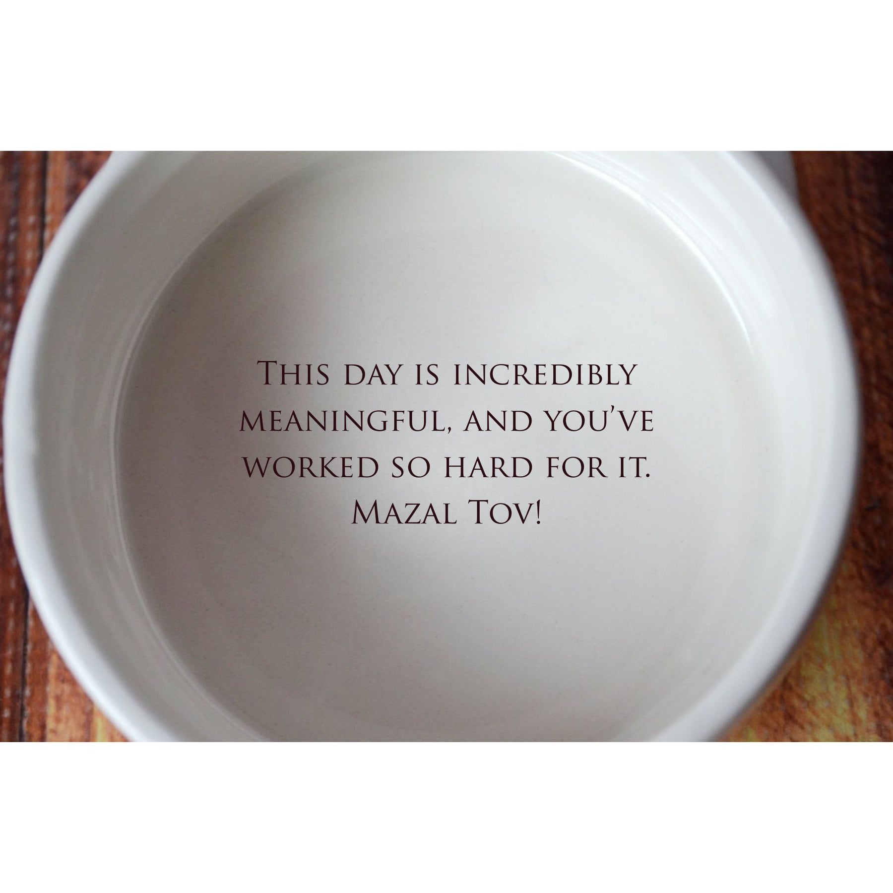 This lovely round keepsake box would be a perfect Bar Mitzvah or Bat Mitzvah gift. It's made of earthenware clay with a Star of David on the lid. The inside of the box it reads: 'This day is incredibly meaningful, and you’ve worked so hard for it. Mazal Tov!'
