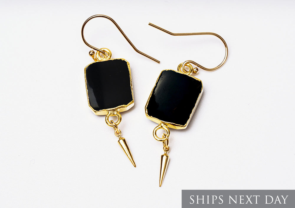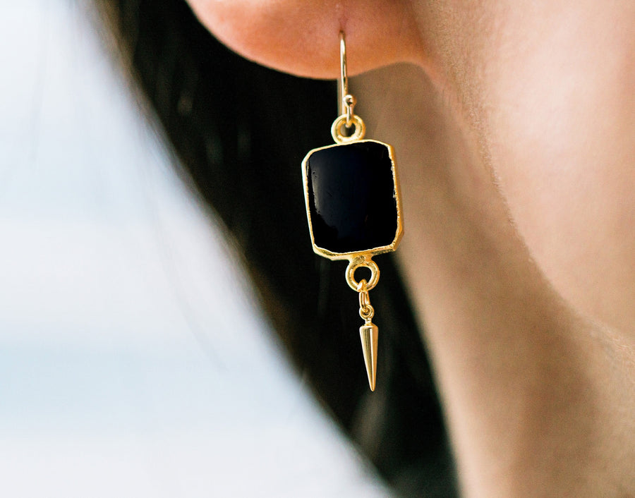 Our beautiful gemstone slice black onyx earrings are a must-have piece for December birthdays or anyone who appreciates the beauty of birthstone jewelry. These earrings feature a genuine black onyx gemstone slice, showcasing its unique natural beauty. Handmade with love, these one-of-a-kind earrings are truly special and makes a perfect gift for her. The striking combination of the black onyx gemstones and expert craftsmanship ensures that these earrings will be a perfect addition to any collection.