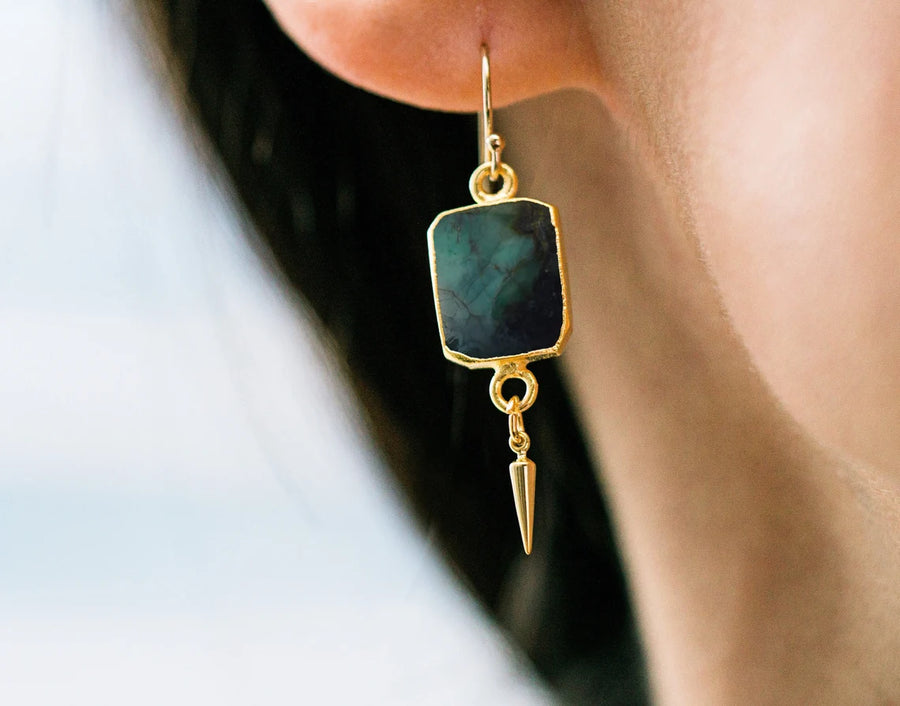 The stones are hung on sterling silver, gold-filled, or silver or gold-plated earring hooks. The tiny spikes at the end are plated in silver or gold and measure approx. 2 X 10 mm. These earrings are perfect to dress up or down and be used for everyday wear.