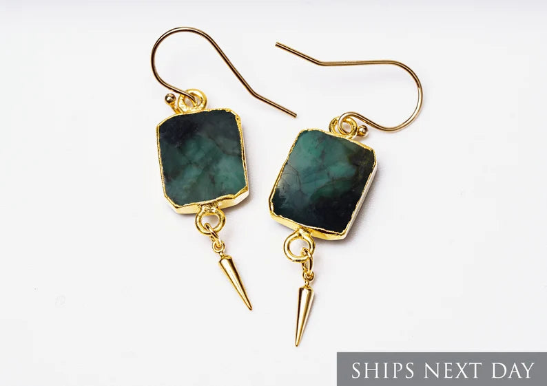 Our beautiful gemstone slice emerald earrings are a must-have piece for anyone who appreciates the beauty of this stone. These earrings feature a genuine emerald gemstone slice, showcasing its unique natural beauty. Handmade with love, these one-of-a-kind earrings are truly special and makes a perfect gift for her. The striking combination of the raw emerald gemstones and expert craftsmanship ensures that these earrings will be a perfect addition to any collection.