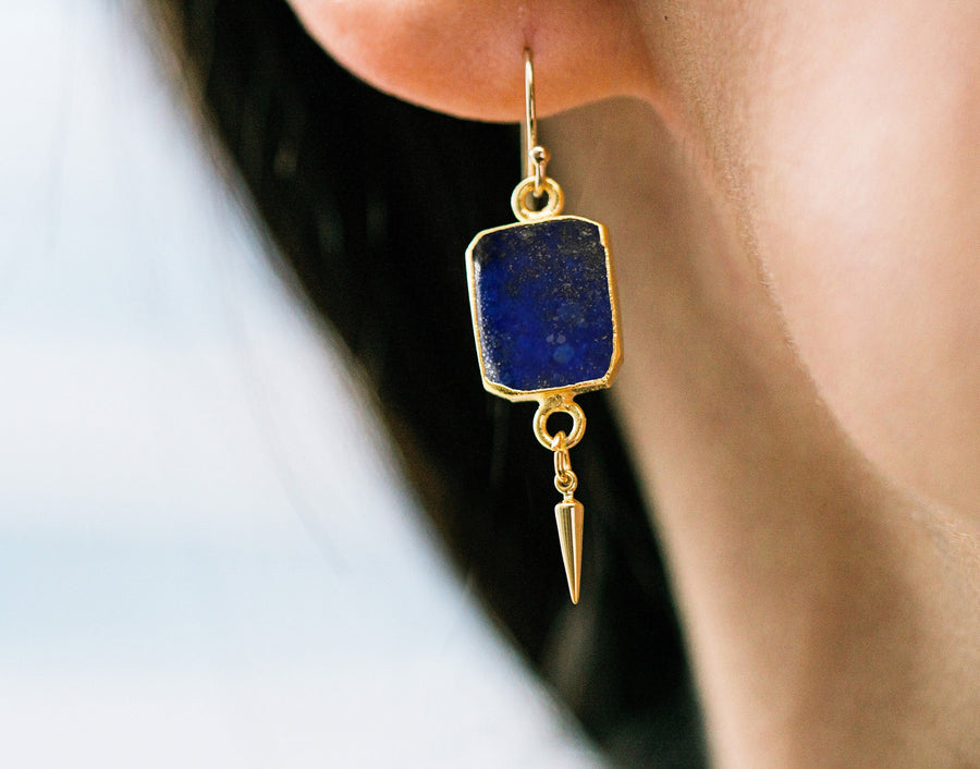 Our beautiful gemstone slice Lapis Lazuli earrings are a must-have piece for September birthdays or anyone who appreciates the beauty of birthstone jewelry. These earrings feature a genuine Lapis Lazuli gemstone slice, showcasing its unique natural beauty. The stone is a beautiful blue shade with flecks of gold in it. Handmade with love, these one-of-a-kind earrings are truly special and makes a perfect gift for her. The striking combination of the Lapis Lazuli gemstones and expert craftsmanship ensures that these earrings will be a perfect addition to any collection.