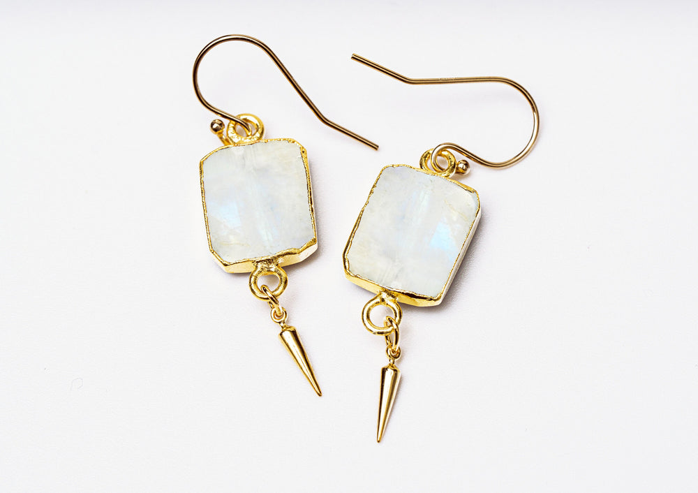 The stones are hung on sterling silver, gold-filled, or silver or gold-plated earring hooks. The tiny spikes at the end are plated in silver or gold and measure approx. 2 X 10 mm. These earrings are perfect to dress up or down and be used for everyday wear.