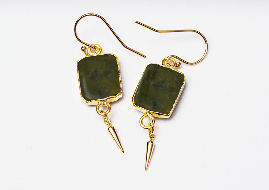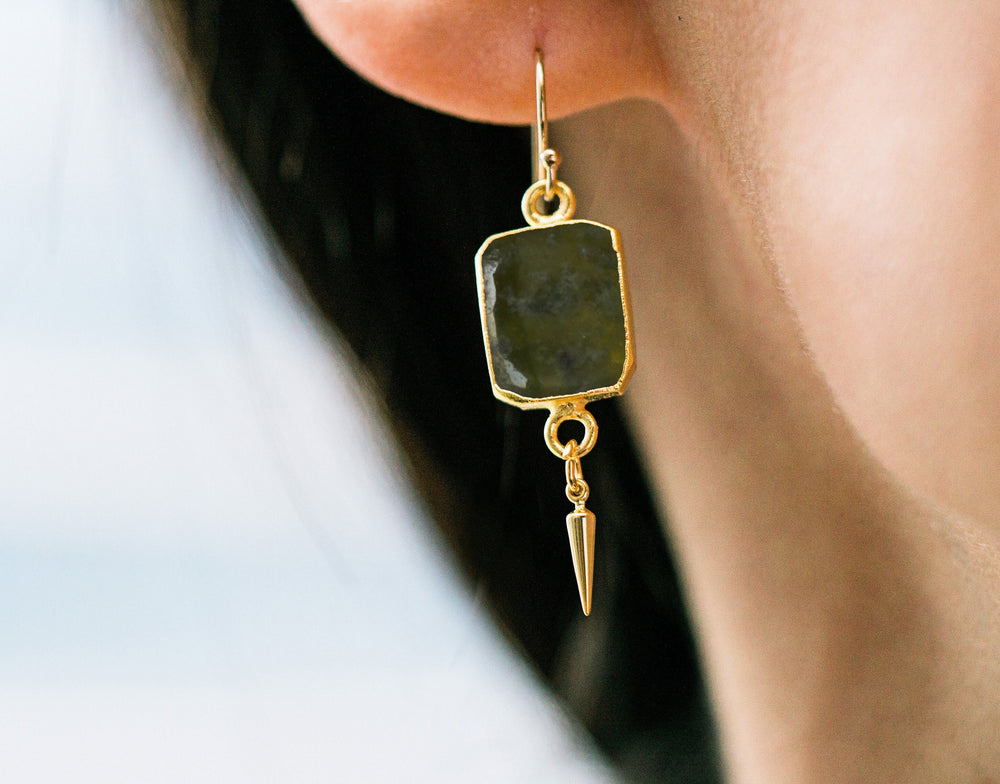 The stones are hung on sterling silver, gold-filled, or silver or gold-plated earring hooks. The tiny spikes at the end are plated in silver or gold and measure approx. 2 X 10 mm. These earrings are perfect to dress up or down and be used for everyday wear.