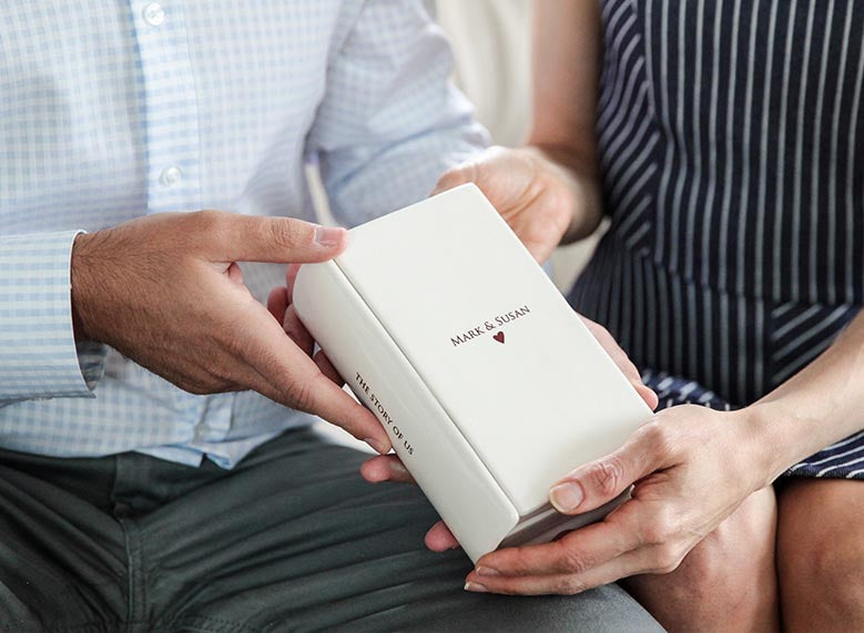 Celebrate your happiest moments together. The book inside is customized with anniversaries and milestones.